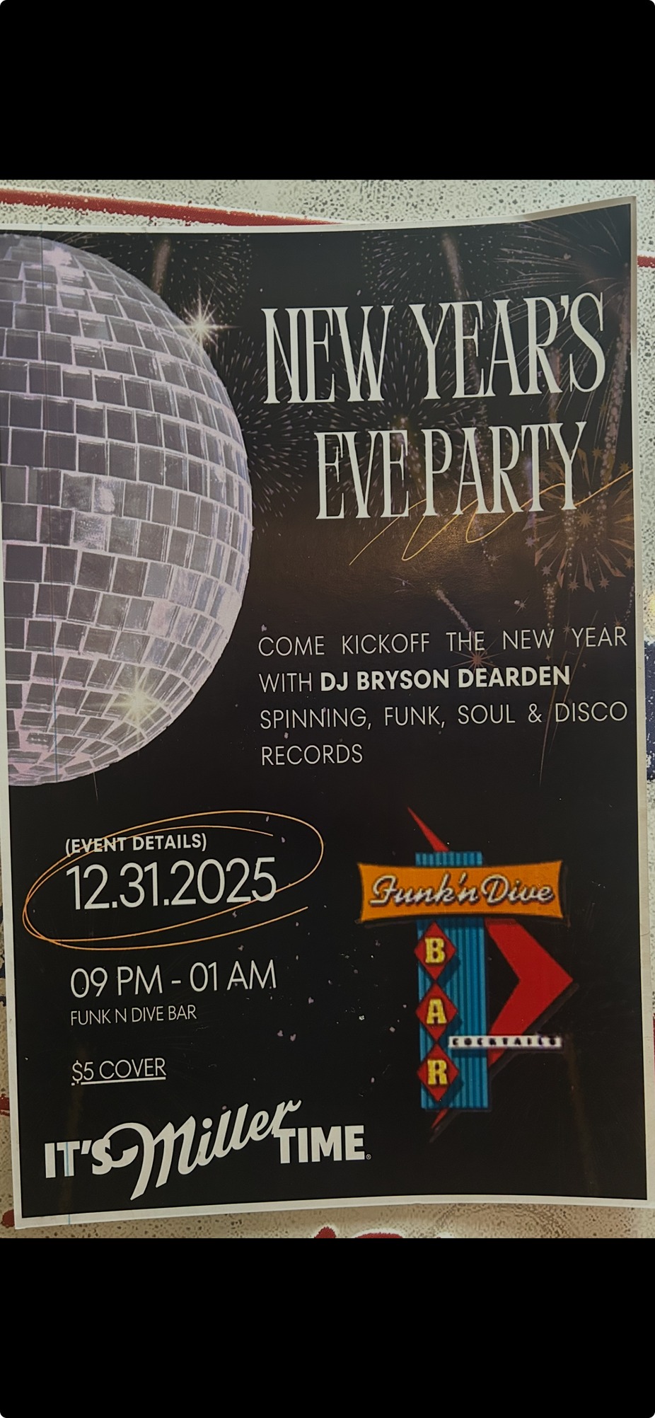 π NEW YEAR'S EVE AT FUNK'N DIVE BAR π Get ready to dance your way into 2024! πΊπ Join us at Funk'n Dive Bar this New Year's Eve for an unforgettable night of funk, soul, and disco with the one and only DJ Bryson Dearden! πΆβ¨