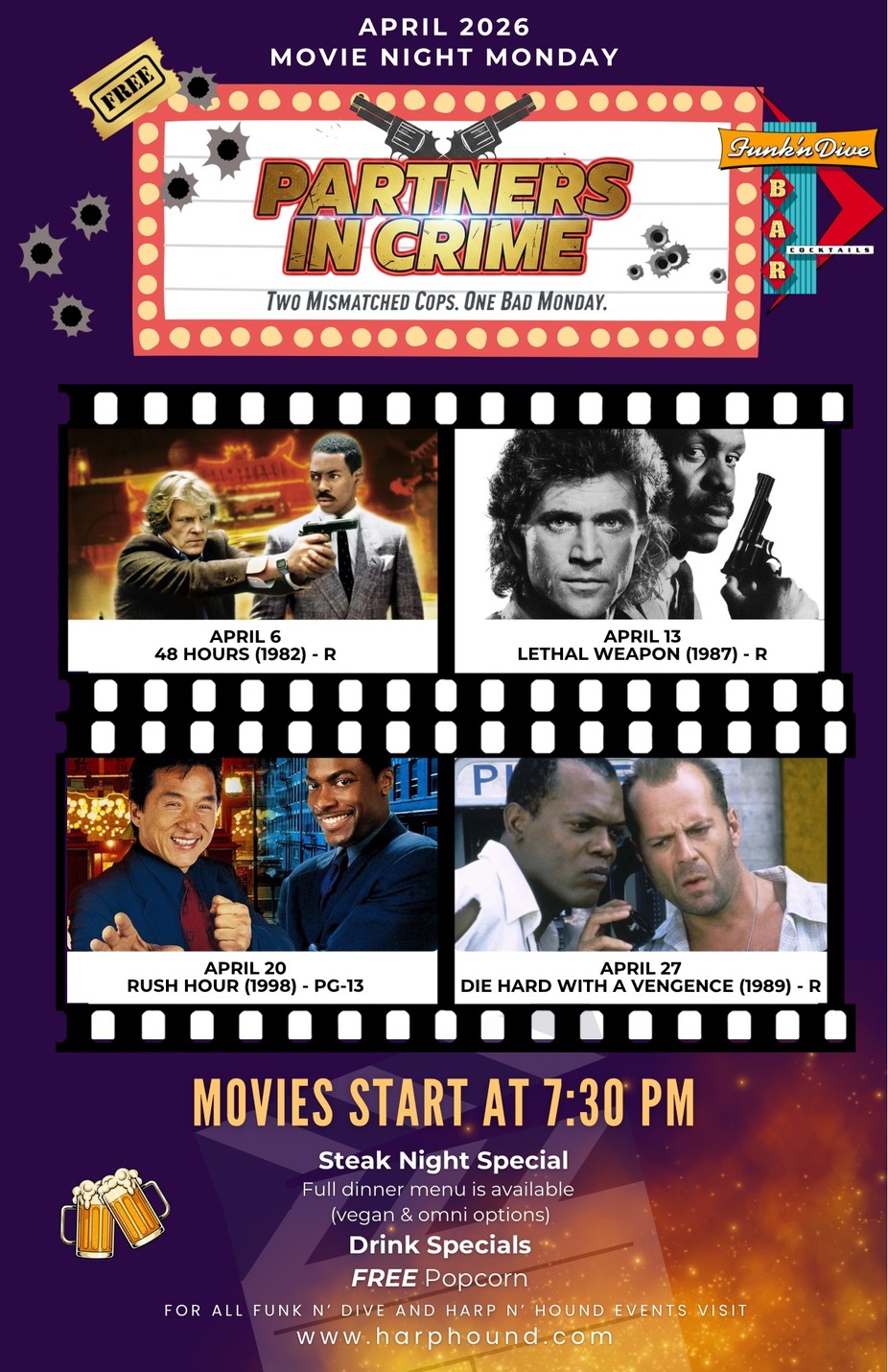 #DinnerAndAMovie #BreakingBingo #HarpAndHound #FunknDiveBar #BingoNight #SteakSpecial #MovieNight