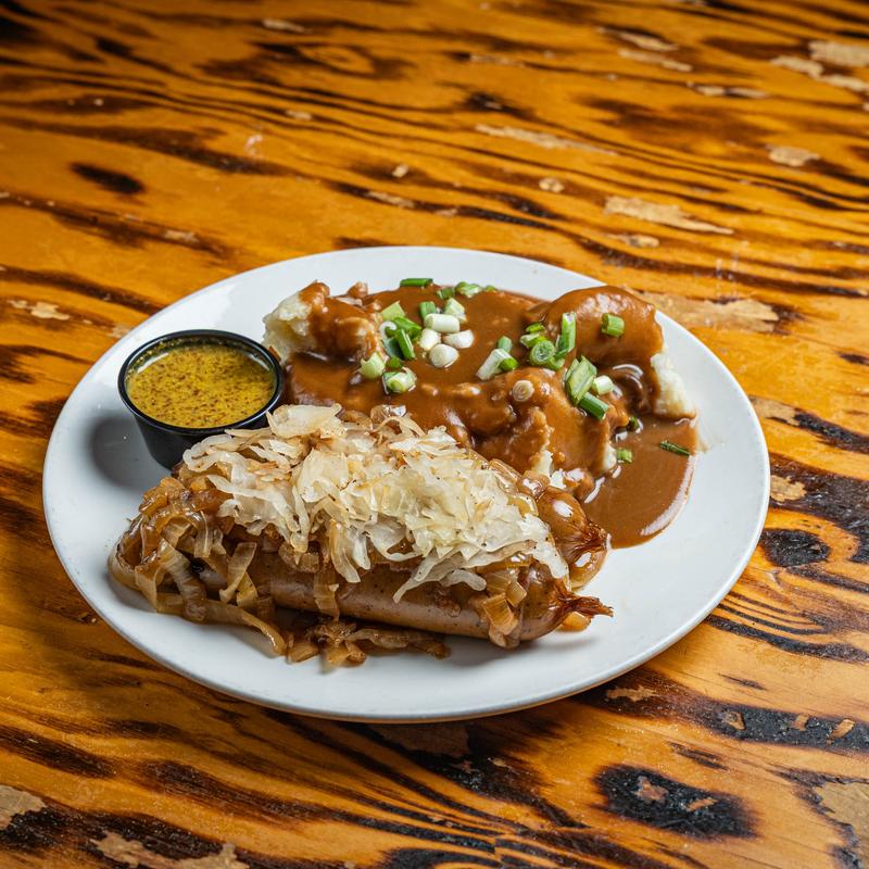 Locally made Guinness-braised sausages and caramelized onion gravy on a bed of mashed potatoes