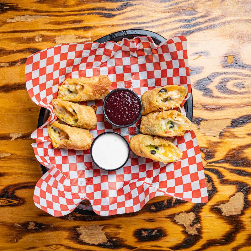 Hand-rolled with chick’n, bacon, black beans, mozzarella, pico de gallo, and avocado. Served with blackberry jalapeño and ranch