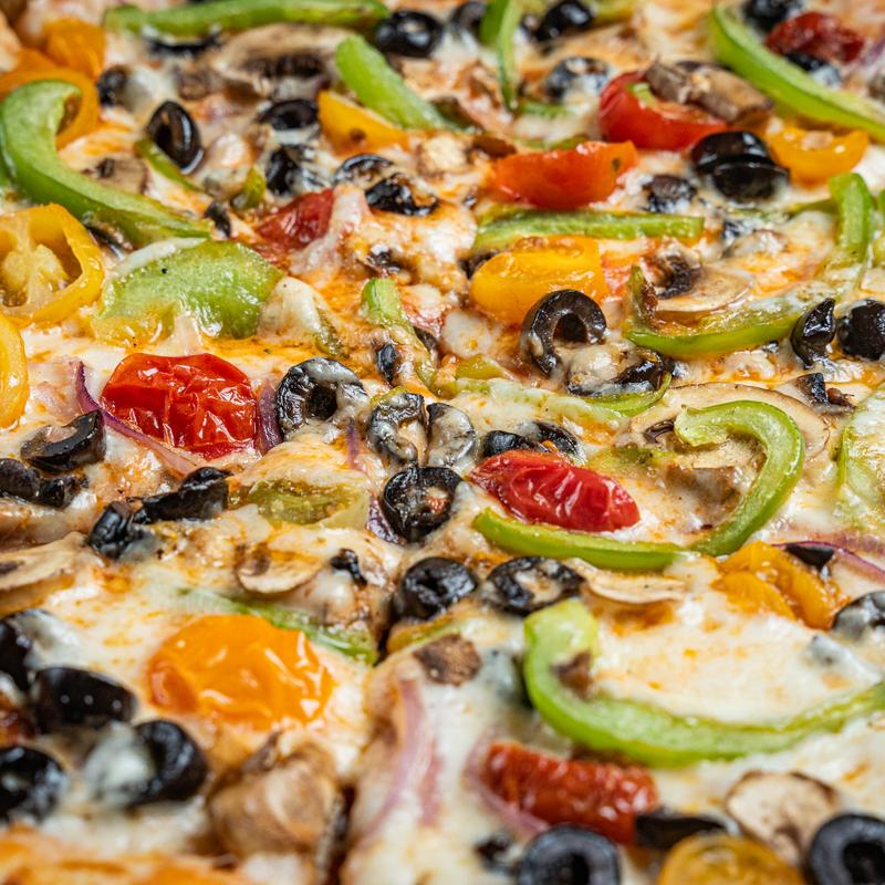 Tomatoes, mushrooms, onions, olives, bell peppers, marinara, and mozzarella