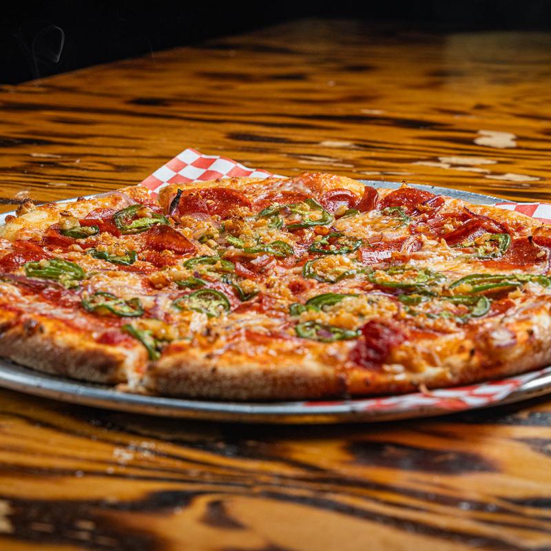 Pepperoni, red onion, fresh garlic, fresh jalapeños, marinara, mozzarella, and a drizzle of agave