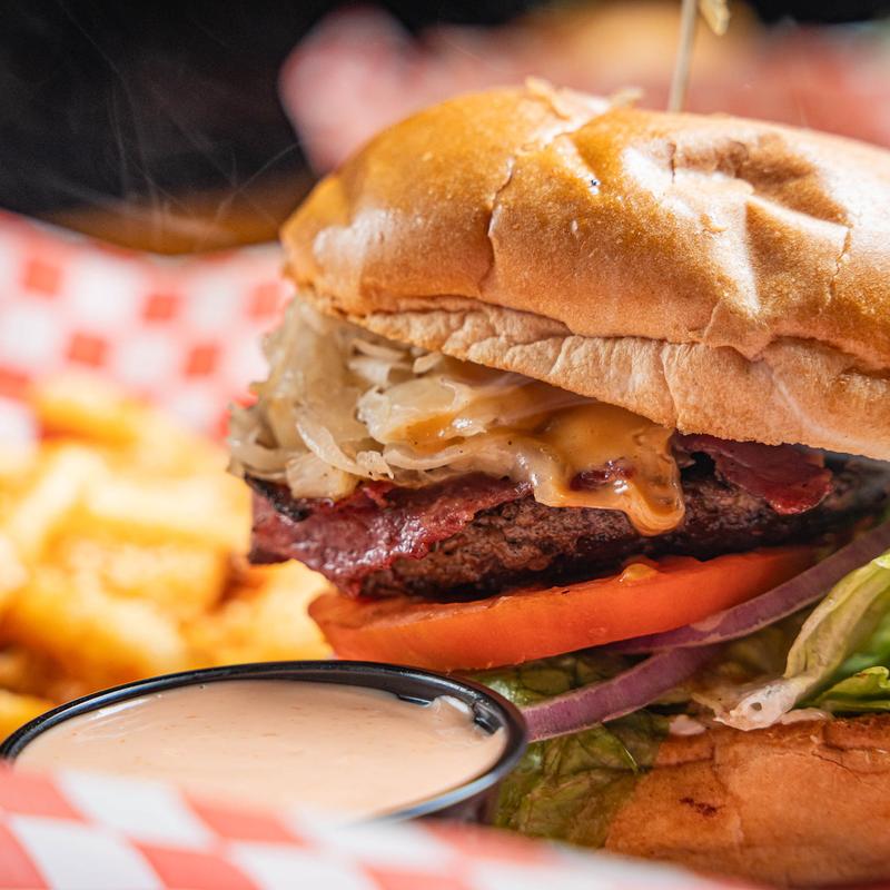 1/3 pound Wagyu burger, bacon, cheddar cheese, guacamole, lettuce, and tomato with garlic aioli on toasted brioche, topped with a sunny side-up egg. Served with breakfast potatoes