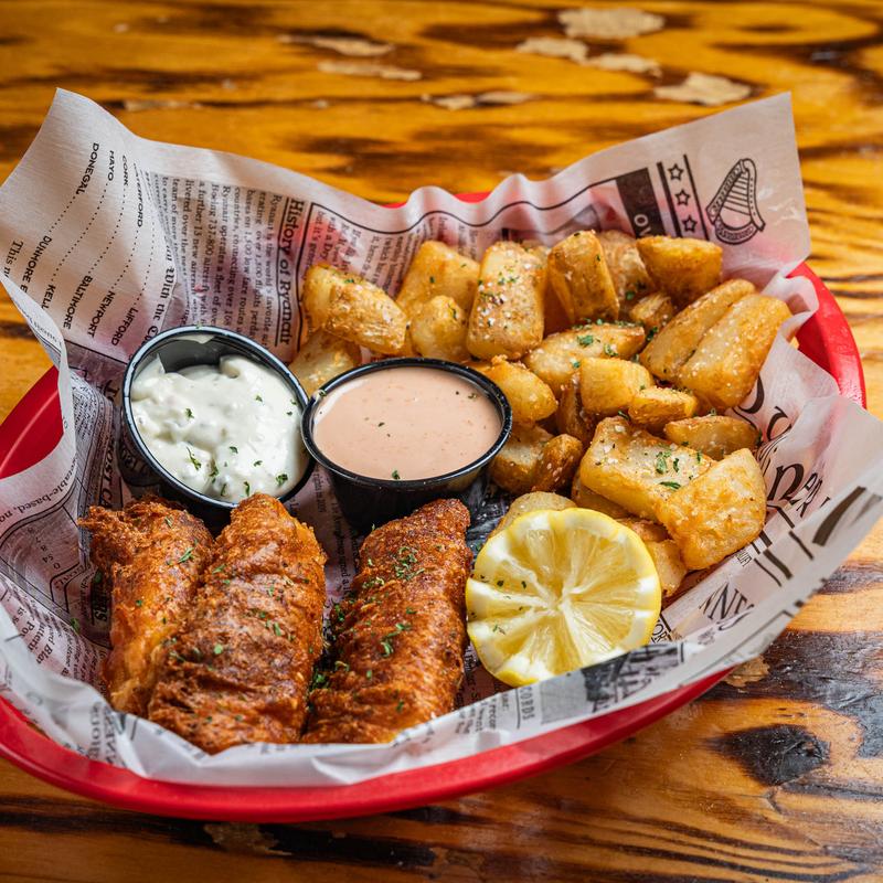 Sustainable Alaskan cod hand-battered to order and served with traditional English chips, lemon, and tartar sauce